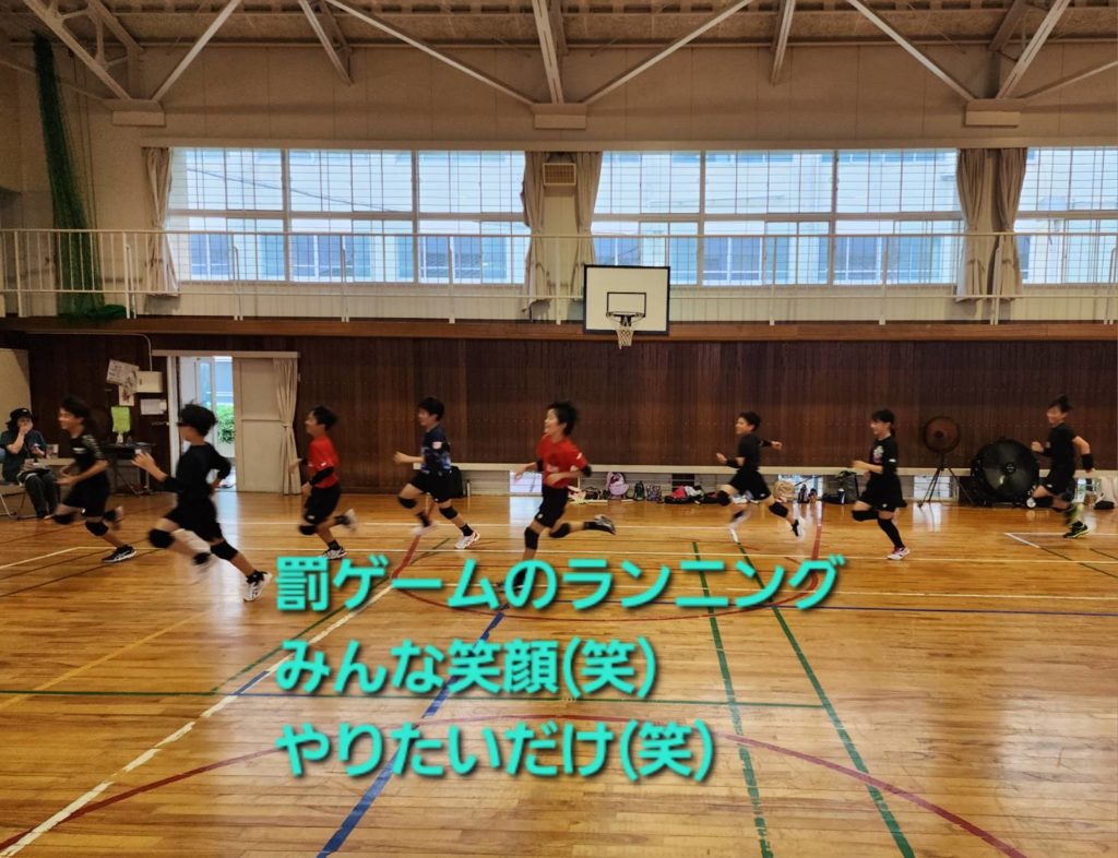 2024-07-16 / 最終更新日 : 2024-07-16 zinjers フォトギャラリー 暑い夏がやってきた! 終了前に少し時間があったので、ABCD全員を3チームに分けて、ゲームをしました。 審判Hコーチの申告により、勝ったチームに不正?!があり、結局は全チーム罰ゲーム(笑)ランニング1周!みんな嬉しそうに笑顔で全力ダッシュ(笑)